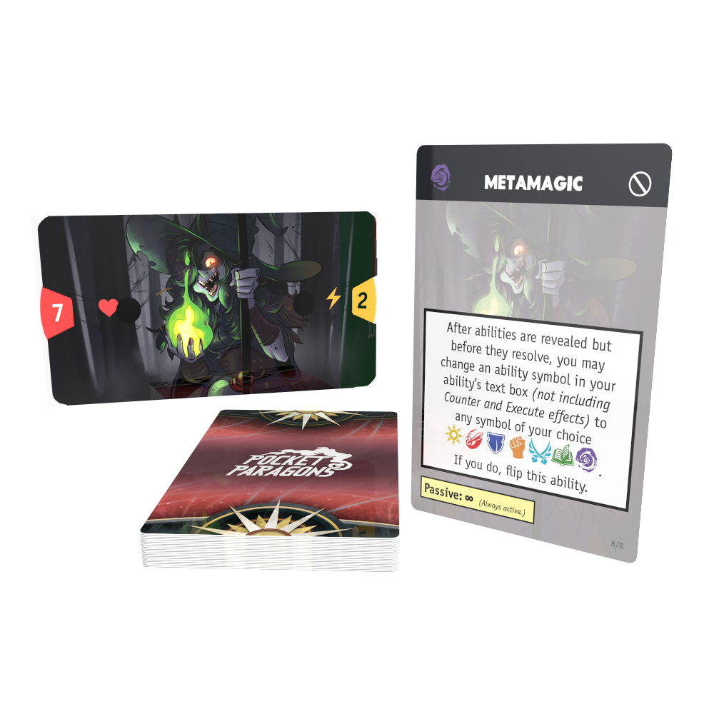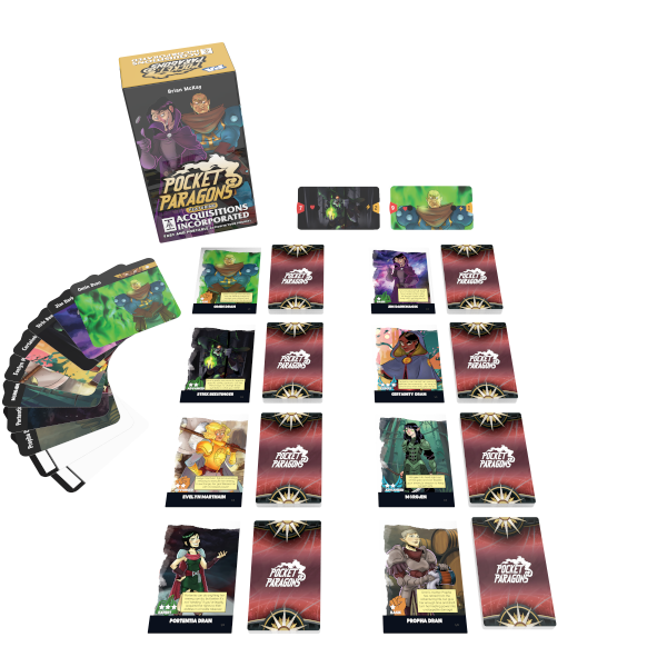 Pocket Paragons is a quick deceptively simple game of big spells and big reads. Take their HP down to 0 or deliver a carefully placed Execute to take your opponent out in an instant! This box features 8 characters from Penny Arcade's Acquisitions Inc. !